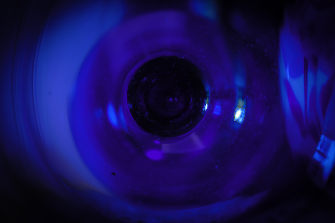 Image 5: BLUE can be found in many places, even at the bottom of a wine glass. Although not as essential to life as water, wine can add enjoyment for those who imbibe. This abstract image was captured with a very slow shutter speed (55 mm, f/4.5, 1/0.5 sec, ISO 200) and looking deep into a blue wine glass, cropping the exterior of the glass and adding post-crop vignetting at -62. To create the desired effect, it was important to adjust the white balance and exposure controls.