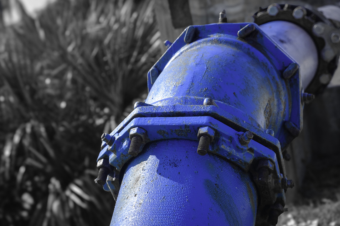 Image 3: Water is a necessity of life, flowing from the ocean through pipes and ultimately into our homes. This image (55 mm, f/5.6, 1/3200 sec, ISO 1600) highlights the infrastructure that delivers this essential resource and emphasizes the interplay of strong light and shadow. Saturation was again -100 for all colors except blue (+100). Hues and luminance all remained at 0. Using AI, the BLUE pipe was masked and inverted, so the background could be desaturated and blurred. Additionally, to further highlight the pipe, I added -15 vignette.