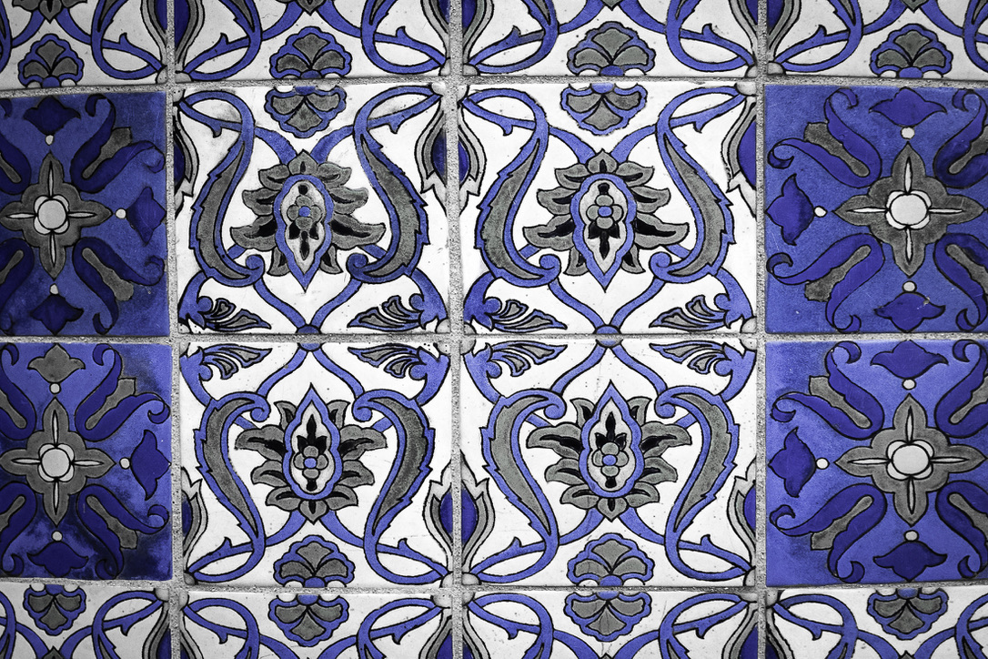 Image 6: Another form of enjoyment is hiking to the tops of hills. On Catalina Island, one can climb to Wrigley Memorial, which is decorated with handmade glazed tiles from the Catalina Pottery plant. This image (55 mm, f/5.6, 1/160 sec, ISO 800) with its sharp contrast and beautiful BLUES and grays started as an aged, yellowed, and rounded wall. To create the image from the capture, saturation, hue, and luminance needed to be adjusted. Additionally, the capture necessitated full transforming, including aspect and x-offset tweaks. Vignetting at -15 created the final image.