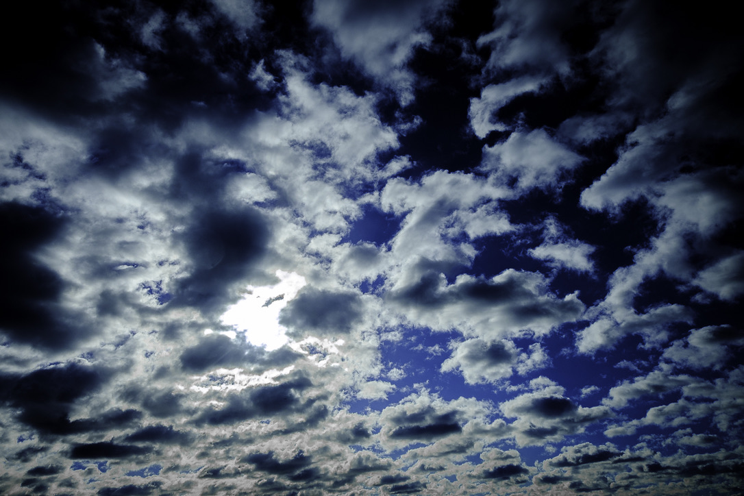 Image 7: For another variety of BLUES, grays, blacks, and whites, one only needs to look up at a cloudy sky. The assortment of colors and textures in this image (18 mm, f/5.6, 1/4000 sec, ISO 500) demonstrates how vivid an image can be even with the saturation turned to -100 for all hues except blue (+34). Interestingly, luminance for purple (-49) was needed in addition to blue (+32) to create the visual intensity of this sky. Sharpening and vignetting (-15) were the final touches.