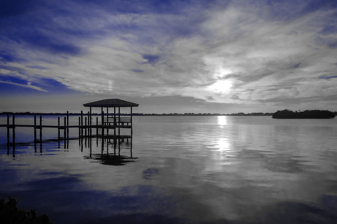 Image 2: A sunset acts as a reminder that as one day ends, there is the assurance of the next day. This sunset off Satellite Beach, Florida (18 mm, f/5.6, 1/4000 sec, ISO 800) shows the stark contrast between the sunset’s yellows and oranges, now rendered in black and white, and the remaining BLUE in the sky and its reflection in the water. All colors other than blue (saturated at +100) are saturated at -100. I found that the aqua hue needed to be turned up to +53 along with blue hue at +11 to create the visual effect I favored. Additionally, I focused on the pier to sharpen the image and added a vignette of -15.