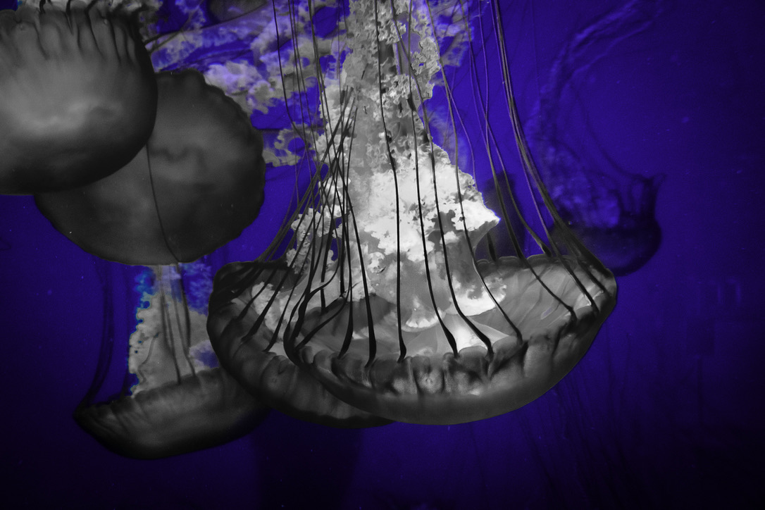 Image 4: All life needs water, even creatures as simple as jellyfish. Captured (30 mm, f/5.6, 1/25 sec, ISO 3200) at the Long Beach Aquarium, this image focuses more on the contrasting black and white of the jellyfish than the brilliant BLUE in the background. To create this striking image, luminance sliders for yellow, green, purple, and magenta needed to be adjusted. Sharpening and post-crop vignette were added for clarity and effect.